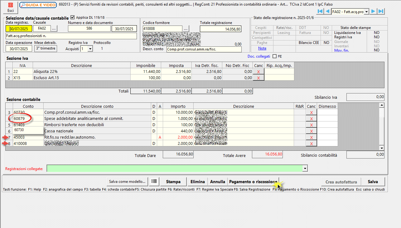- registrare correttamente la fattura in prima nota che genera il compenso facendo attenzione alla causale contabile da utilizzare ed ai conti contabili più appropriati tra quelli messi a disposizione. la ritenuta, ove presente in fattura, va sempre rilevata manualmente a storno del debito verso il fornitore che si genera dalla fattura.