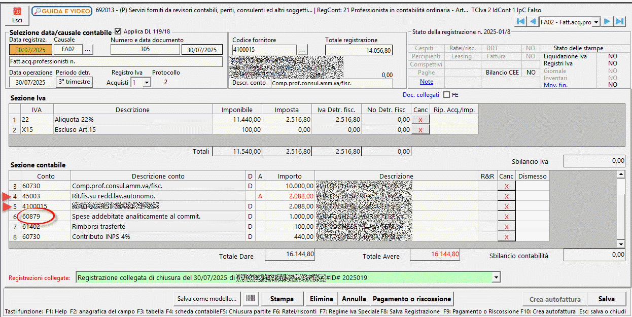 L’importo delle spese analiticamente addebitate, non più considerato compenso del professionista, dovrà quindi essere rilevato tramite il conto di costo creato ad hoc per le fatture “60879” che ne consente la corretta qualificazione in Bilancio.